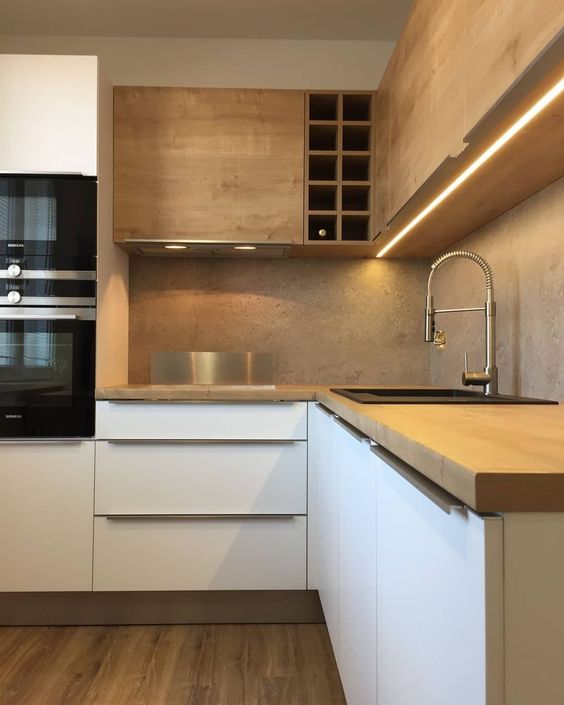 Цена указана за метр погонный. Современная кухня в минималистичном дизайне. Фасады в белом цвете, столшеница и верхние ящики в цвете светлого дерева. Угловой тип размещения.