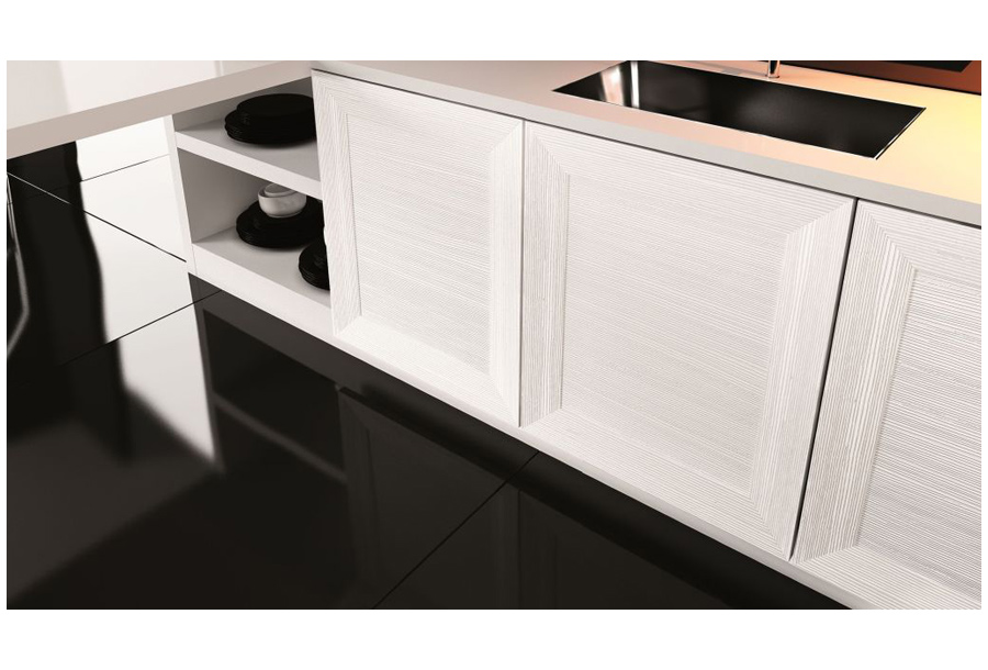 Темная столешница под мрамор, черные стекла и матовые ручки.