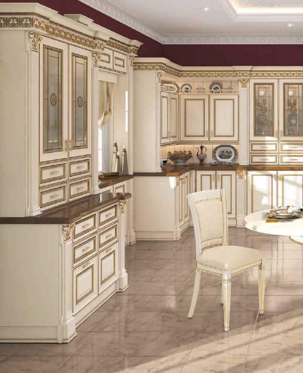 Кухня угловая Al'Tako имеет невероятно привлекательный и величественный внешний вид,выполненный в классическом стиле ампир, созданном специально для истинных ценителей благородной роскоши и изящества в интерьере. Фасад кухни выполнен в спокойном оттенке столовой кости с позолоченными элементами, витражными стеклами и ажурными карнизами.