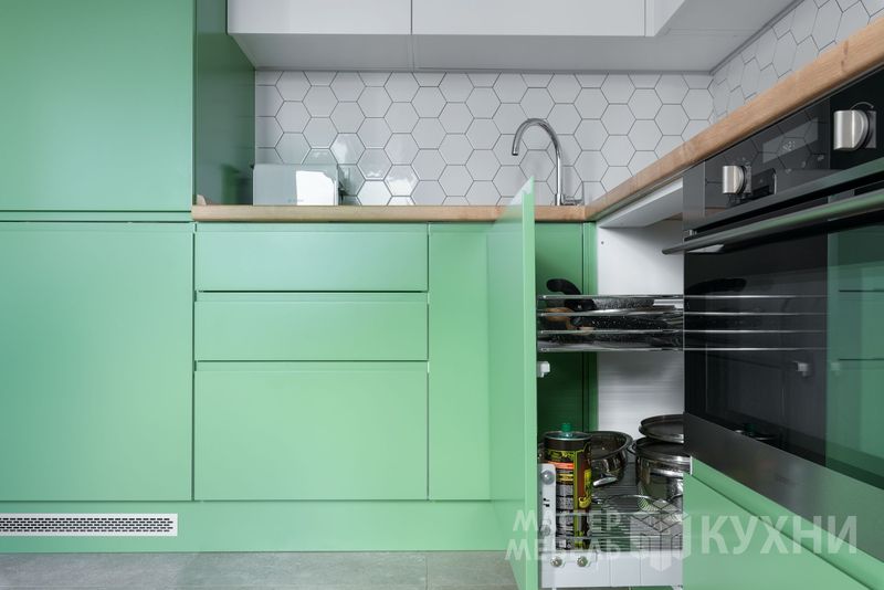 Ниши для кухонной техники, множество шкафчиков для хранения, удобная фурнитура.
