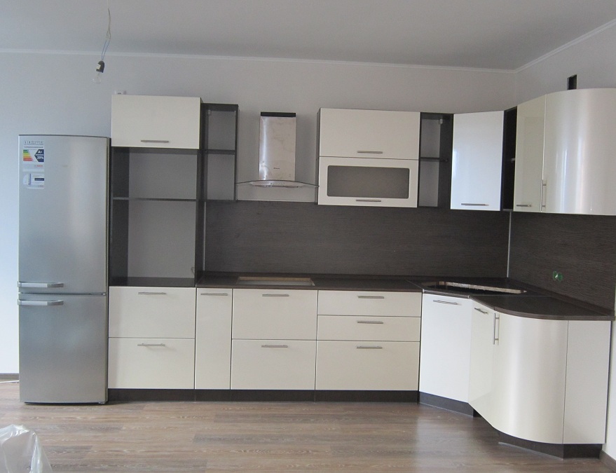 Представленная угловая кухня выполнена в белом цвете. Столешница и фартук модели исполнены в цвете темного ореха. Гарнитур исполнен в современном стиле с минималистичным дизайном.