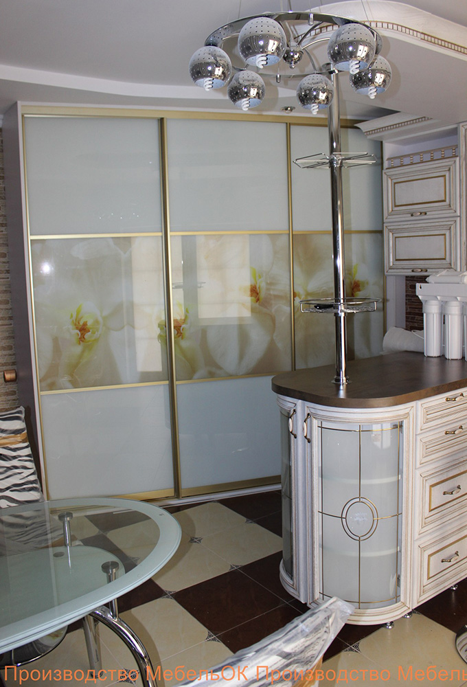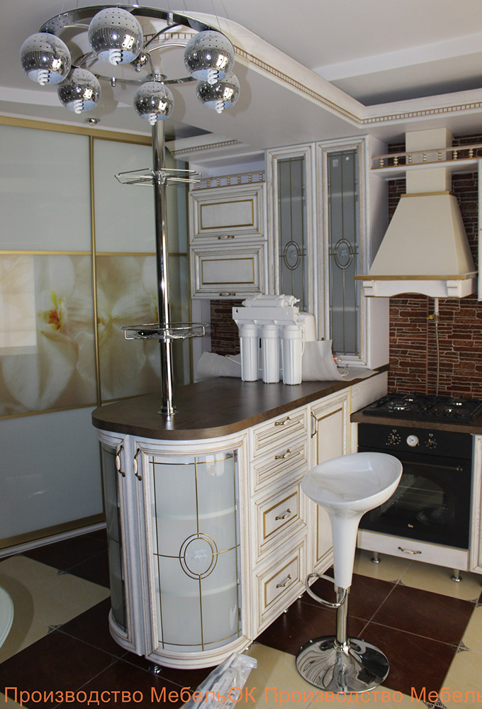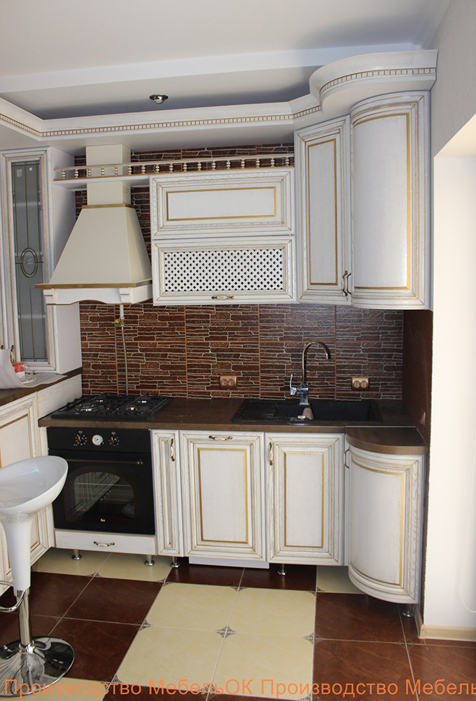 Угловая кухня из ЛДСП. Навесные шкафы декорированы стеклами.