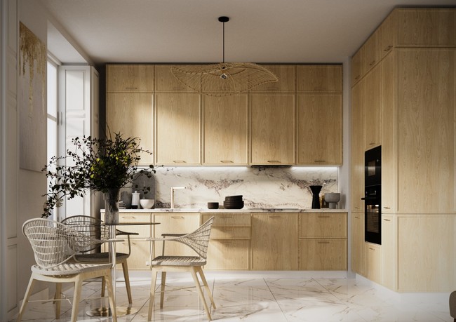 Угловая кухня нейтрального цвета с высокими верхними шкафами