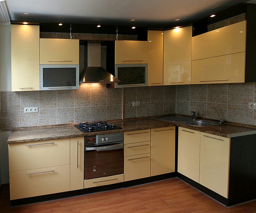 Светлая кухня с диагональным углом представляет собой компактную конструкцию. Оригинально смотрится контрастное сочетание темных корпуса и светлых шкафов. Кухня декорируется вставками из непрозрачного стекла.
