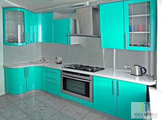 Кухня угловая бирюзовая с белой столешницей и радиусными фасадами