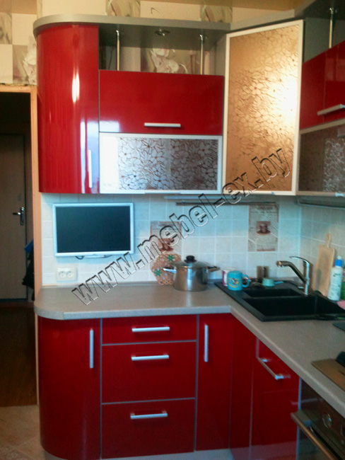 код 48148Глянцевые фасады насыщенного бордового цвета. Декор вставками стекла с пескоструйным рисунком.