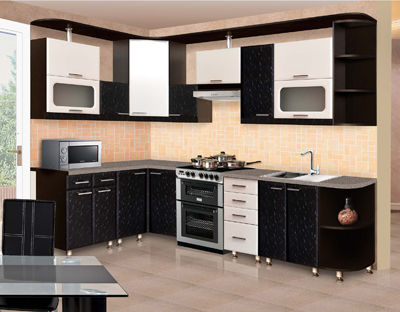 Черная угловая кухня «Лиза» выполнена в стиле модерн. Темные фасады отлично дополняются белыми створками шкафов, декорированными вставками матового стекла.
