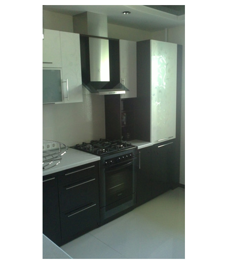 Стиль этой кухни по достоинству оценят ваши гости. Строгий черный силуэт этой мебели подчеркивают хромированные ручки. Дверь большого шкафа декорирована росписью.