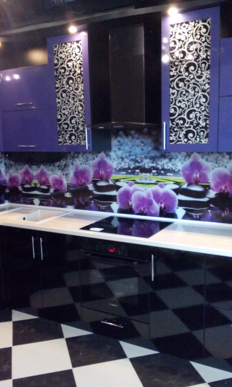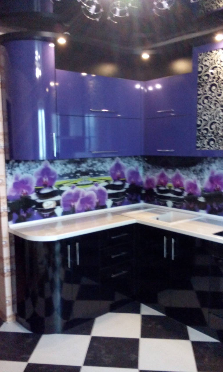 Темные тона угловой кухни выглядят красочно и завораживающе. Фасады сделаны из пластика, верхняя часть гарнитура окрашена в фиолетовый цвет, нижняя – в черный.