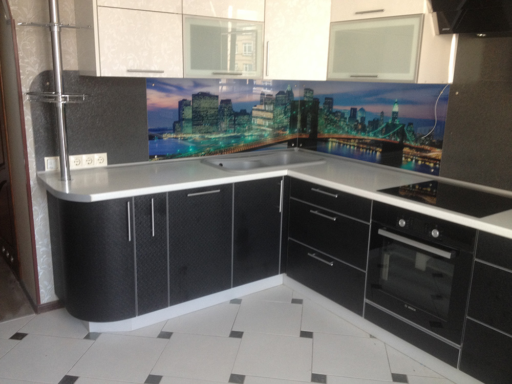 Черно-белая угловая кухня с ярким стеклянным фартуком