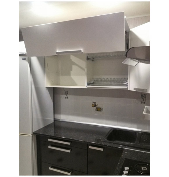Угловая кухня со шкафчиком для вытяжки и толстой прочной столешницей. Имеется несколько вместительных ящиков для посуды. Стильный контрастный дизайн не только делает кухню независимой от особенностей системы освещения, но и визуально увеличивает высоту потолка.