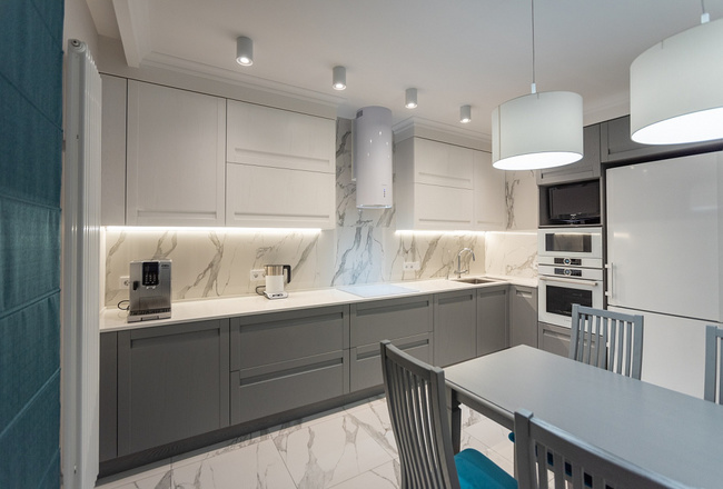 Светлая цветовая гамма фасадов и столешницы.