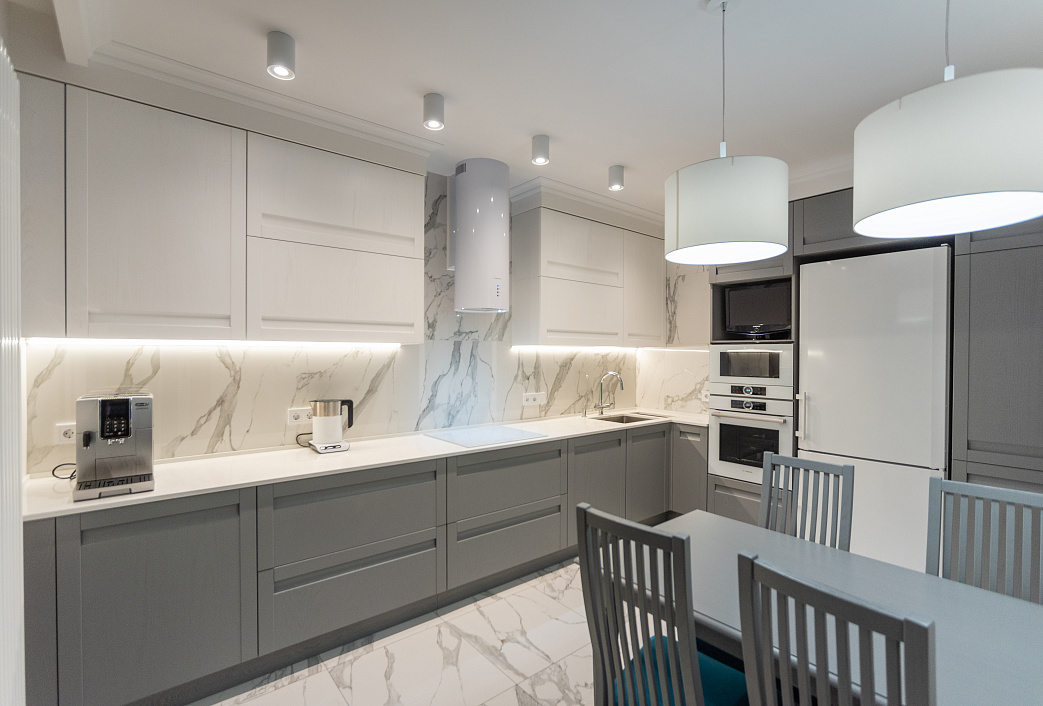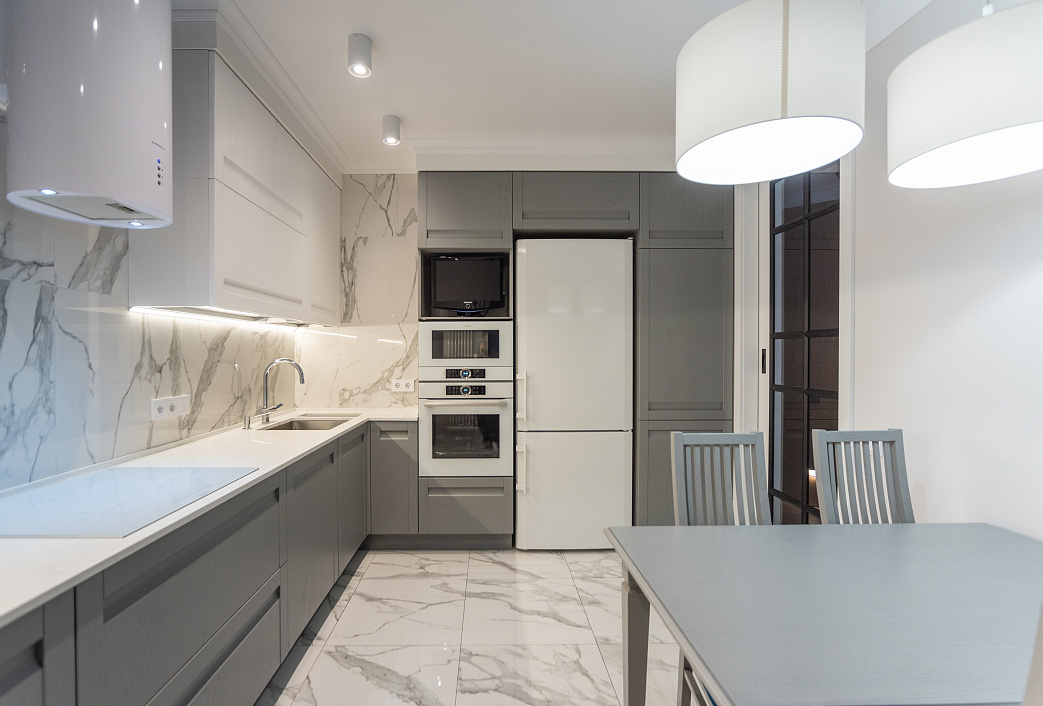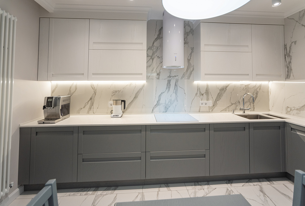 Прямая кухня «Оля» МДФ 2.2 м, мрамор серый/мрамор графитовый
