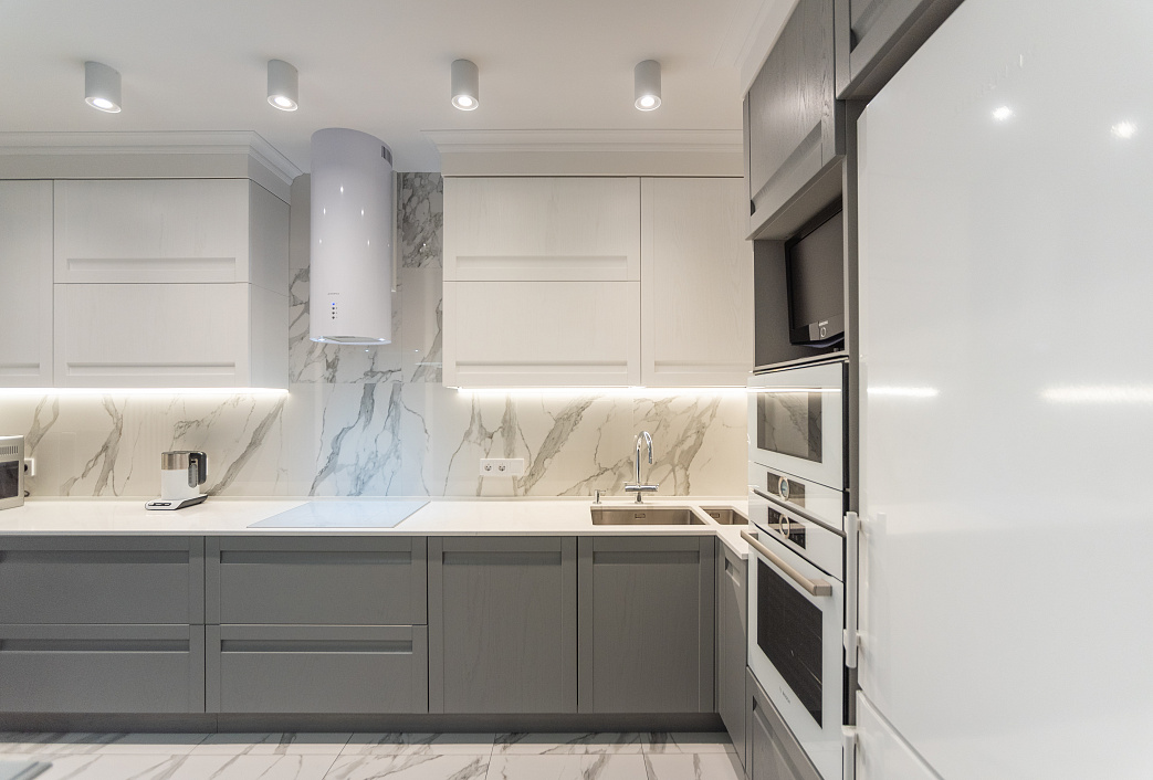 Неоклассическая островная кухня с фасадами из МДФ крашенного.