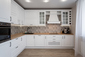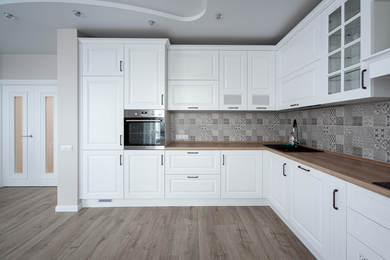 Белые фасады с фрезеровкой. Ширина кухни 180 см.