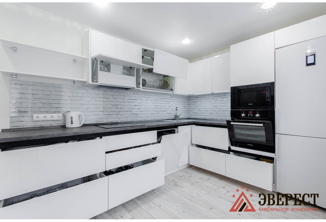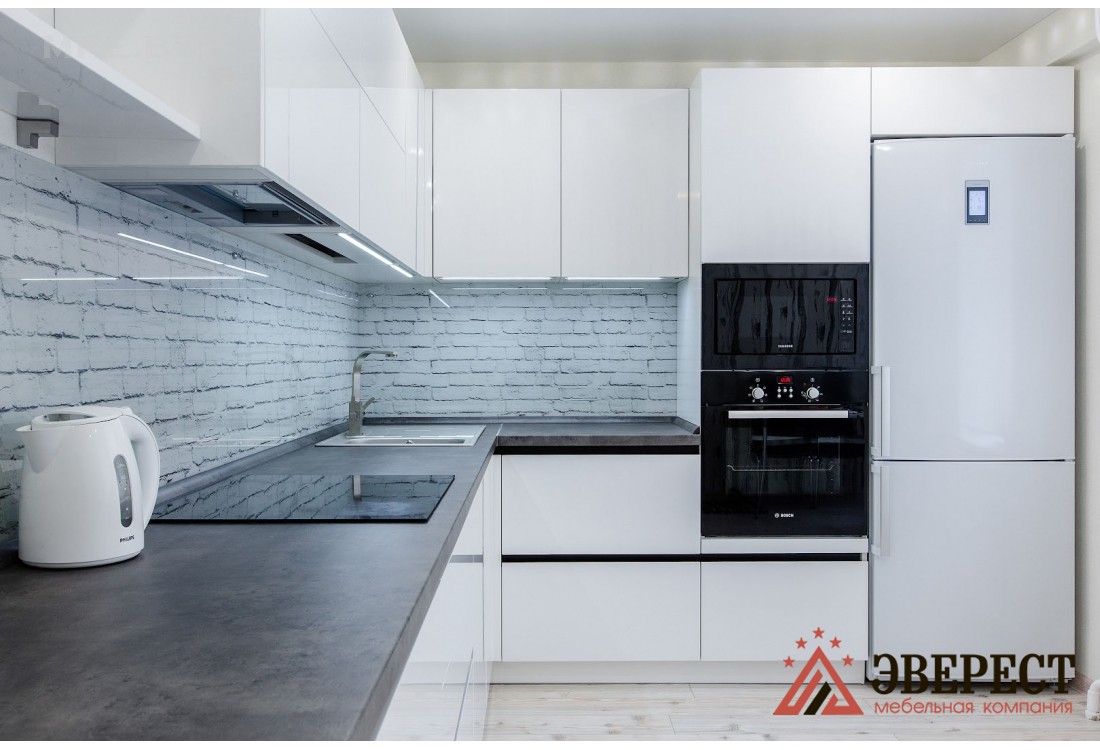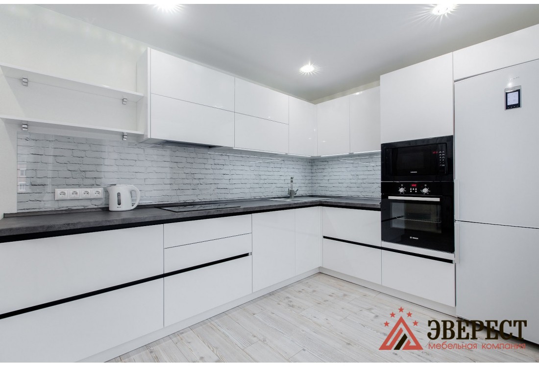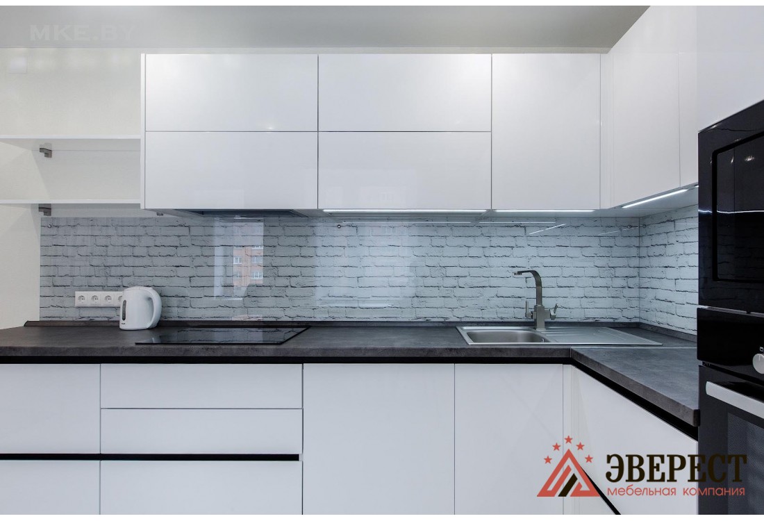 Белая глянцевая кухня. Фасады кухни - устойчивый к влаге и высоким температурам крашенный МДФ. Кухонный фартук изготовлен из закаленного стекла с фотопечатью. Белая кухня открывается за счет установленных в корпус алюминиевых профилей. Видимые места стыковки элементов корпуса кухни соединены скрытым крепежом. Глянцевая кухня оснащена подсветкой рабочей зоны, благодаря чему не только созданы более комфортные условия работы на кухне, но и визуально подчеркивает современный дизайн кухни.