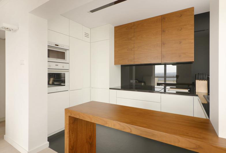 Данная модель угловой кухни исполнена в преобладающем сочетании белого и насыщенного древесного оттенка. Столешница гарнитура выполнена в темно-сером цвете, что удачно сочетается с общим дизайном гарнитура. Фасады шкафчиков лишены привычных ручек и открываются от легкого нажатия.