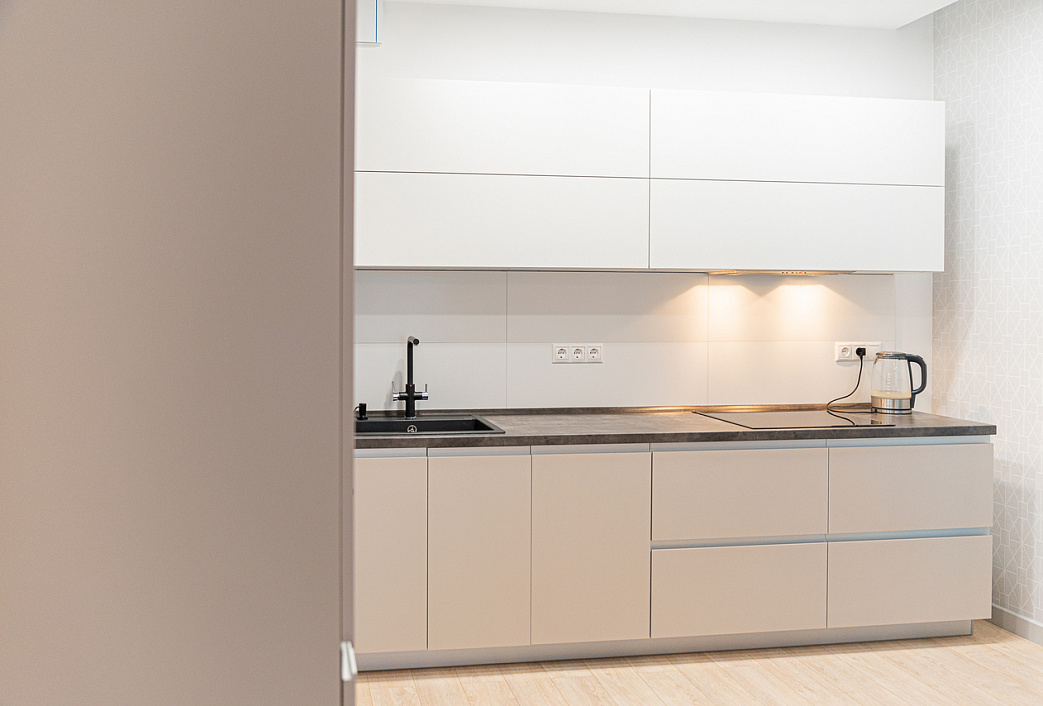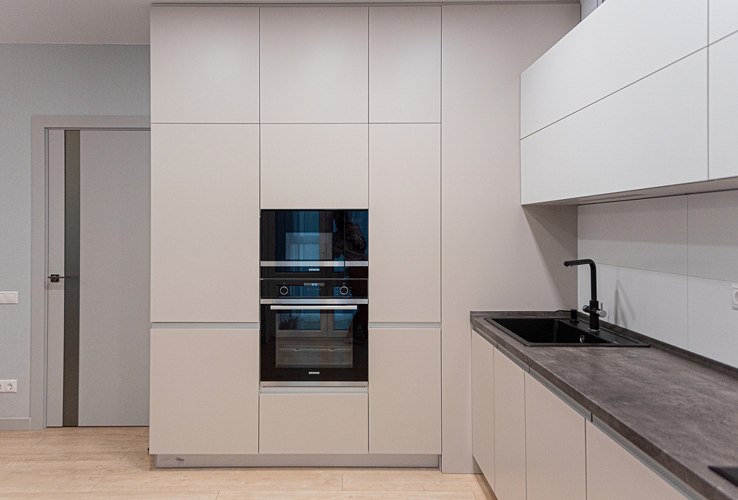 Современная кухня со столешницей и фурнитурой в комплекте.