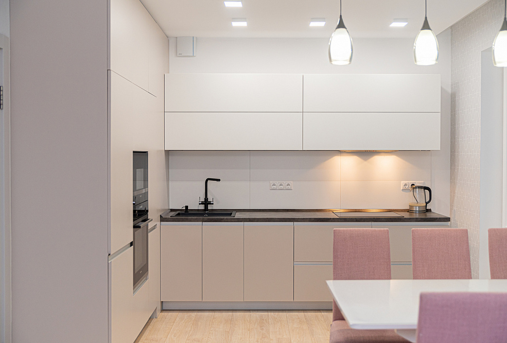 Современный кухонный гарнитур из ДСП в скандинавском стиле.
