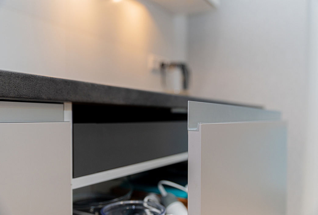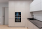 Островная кухня в скандинавском стиле с белыми матовыми фасадами с интегрированными ручками.