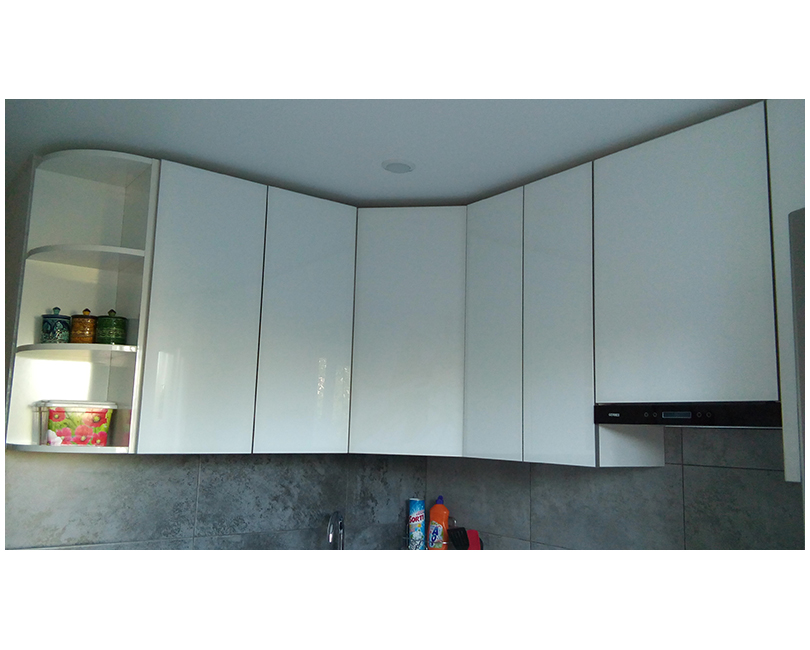 Оригинальная угловая кухня их МДФ выполнена в лаконичном дизайне с фасадами без ручек. Вместо ручек в кухонном гарнитуре используется надежная система пуш-ту-оупен, позволяющая легко и быстро открыть дверцы одним нажатием. Светлый дизайн гарнитура придаст кухне ощущение новизны и свежести. Функционал дополнен боковыми полочками для специй, кофе или чая.
