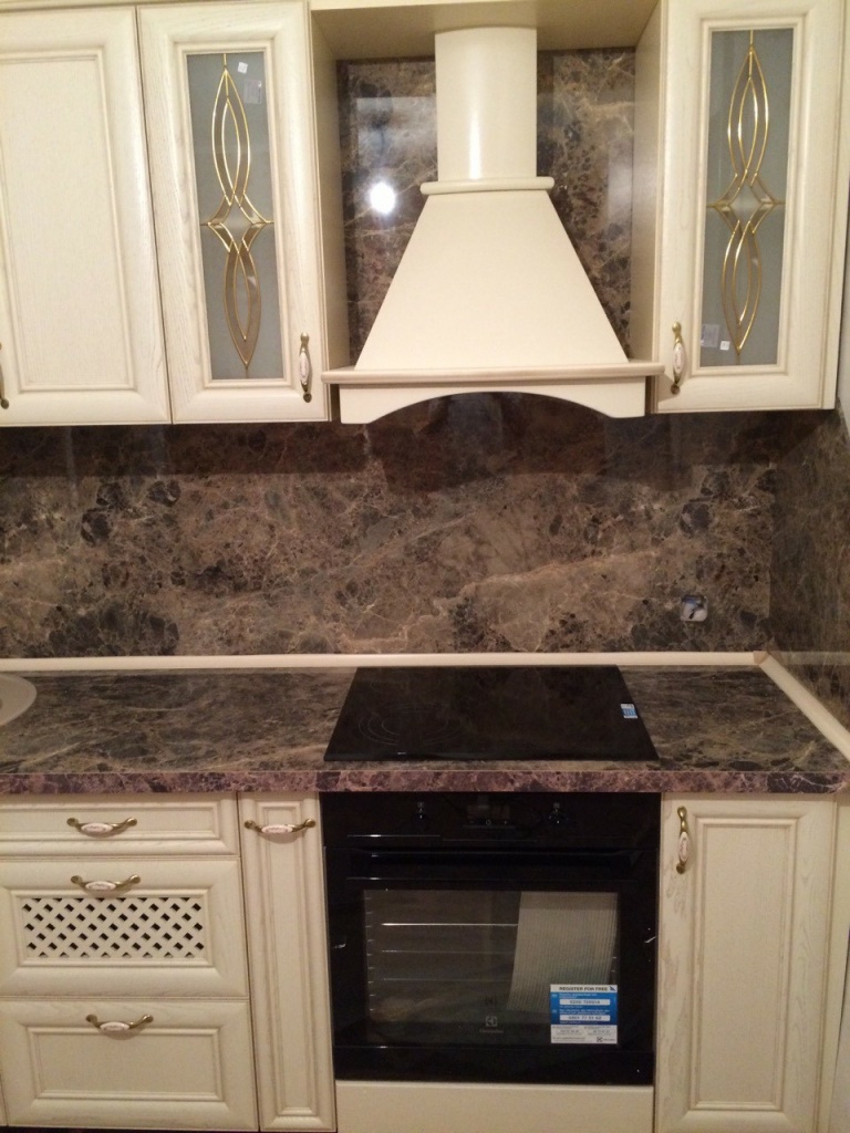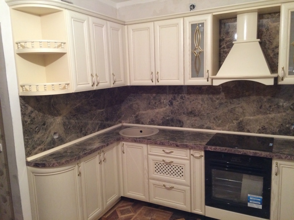 Угловая кухня, выполненная из натурального ясеня, представлена в классическом стиле. Несколько створок подвесного модульного ряда украшены стеклянными вставками с оригинальным узором. Предусмотрено также несколько открытых полочек для различных декоративных предметов. Фигурные золотистые ручки изготовлены из прочного металла.