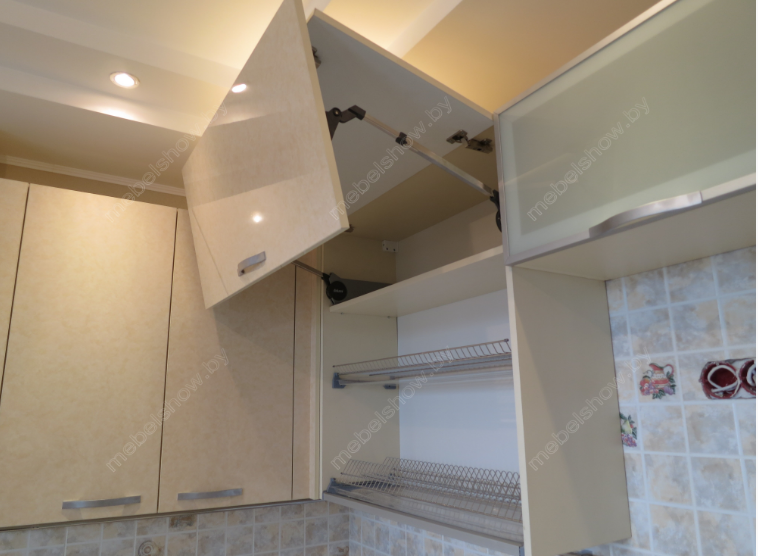 Глубина навесных шкафов 30 см. Удобные металлические ручки.