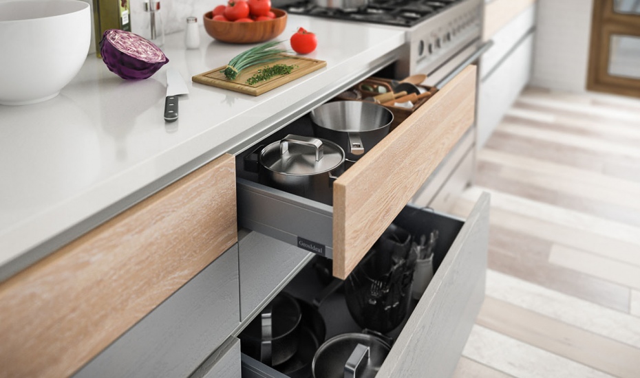 Модульная кухня без ручек с гладкими матовыми фасадами с имитацией шлифованного бетона.