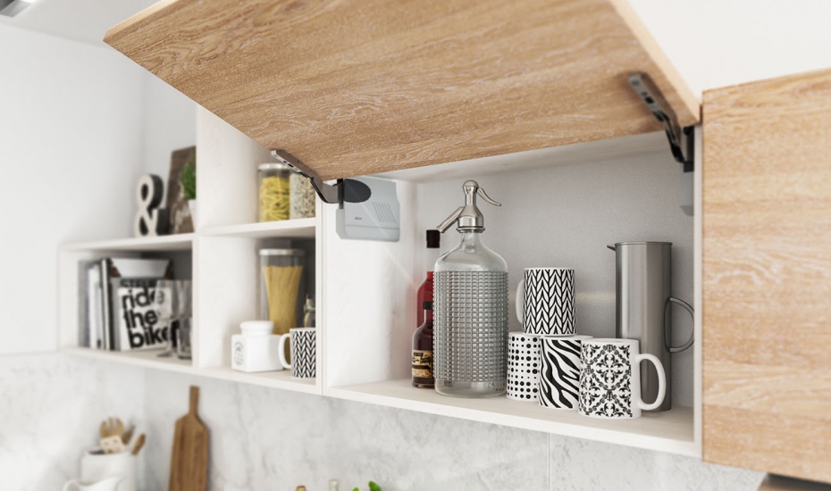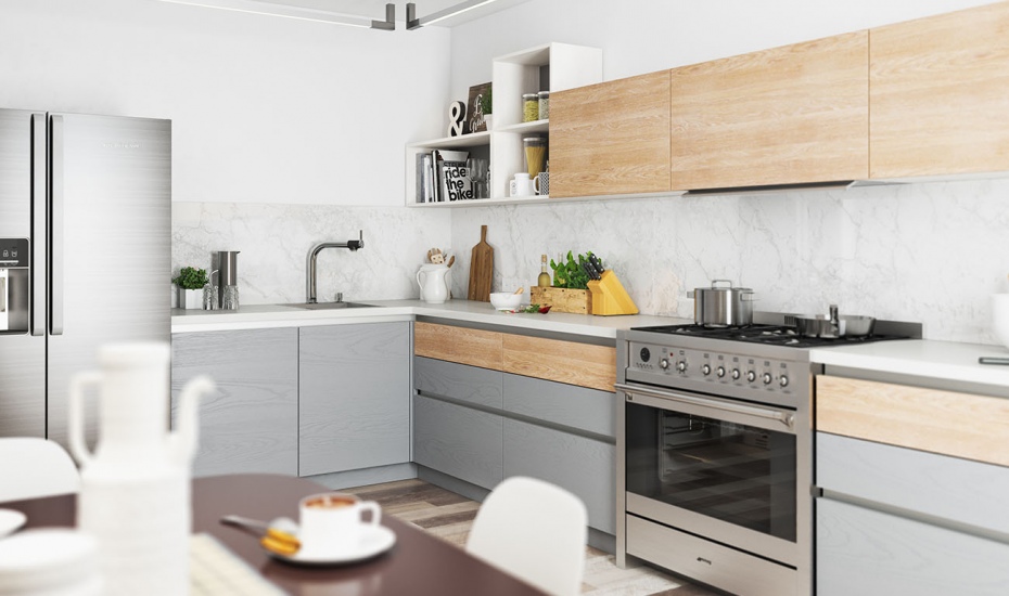 Угловая кухня с компактными подвесными шкафчиками, комбинированные фасады, удобная фурнитура.
