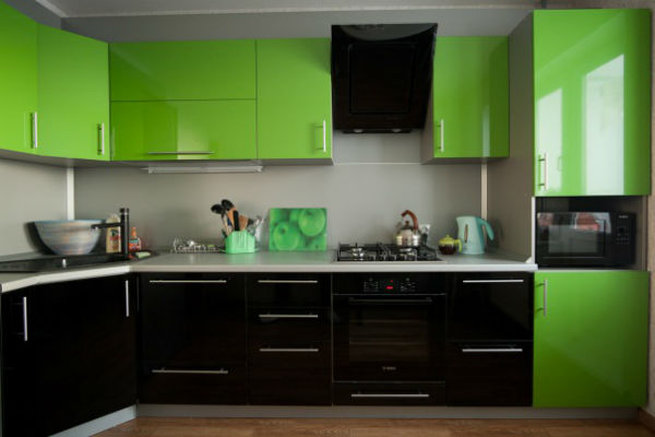Кухня характеризуется своей угловой конструкцией. Комбинированные салатовые и черные фасады делают кухню очень стильной, а также современной.
