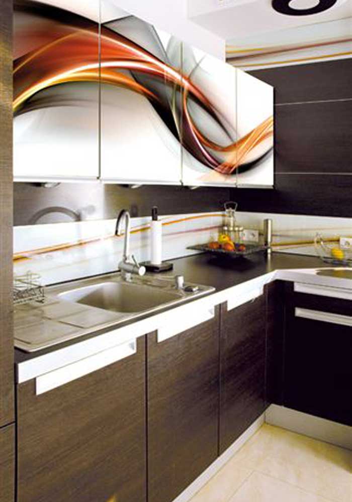 Кухня угловая компактна, ее можно установить в любом по размеру помещении. Скинали кухни выполнены в тон верхних фасадов, а нижние фасады – в тон столешницы. Красочный дизайн дополняет фотопечать на фасадах белого цвета. Удобство и функциональность обеспечит встроенная подсветка.