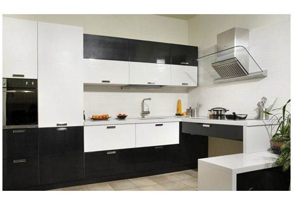 Корпус угловой кухни изготовлен из ДСП. Фасад гарнитура исполнен в комбинировании черного и белого пластика. Высокое качество материалов обеспечит привлекательный внешний вид кухни на долгое время.