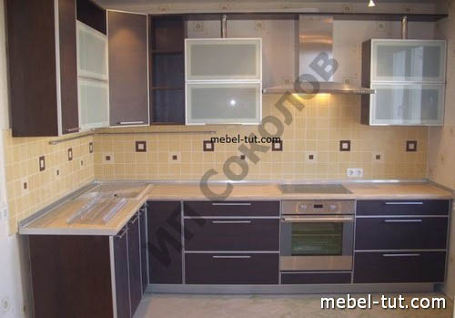 Угловая кухня оснащена нишей для встраивания духового шкафа. Навесные полки дополнены тонированными витринами. Тонированные витрины, изготовленные из закаленного стекла, окантованы хромированными вставками.