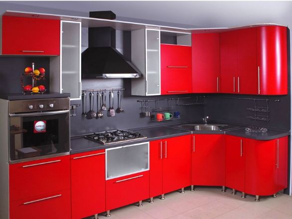 Стильная красная угловая кухня покрыта составом, обеспечивающим фасадам глянцевый блеск. Некоторые шкафчики имеют вставки из матового стекла. Гарнитур оборудован релинговой фурнитурой. Данная модель способна сделать приготовление пищи ярким и нескучным.