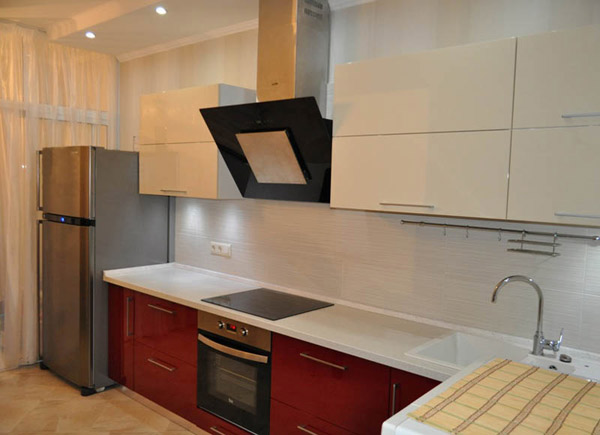 Угловая кухня выполнена из высококачественных материалов, характеризуется высокой функциональностью и удобством. Под навесными ящиками установлены светильники, которые сделают работу более комфортной, позволят сэкономить на электроэнергии. Нижние фасады окрашены в красный глянец, верхние – в белый.