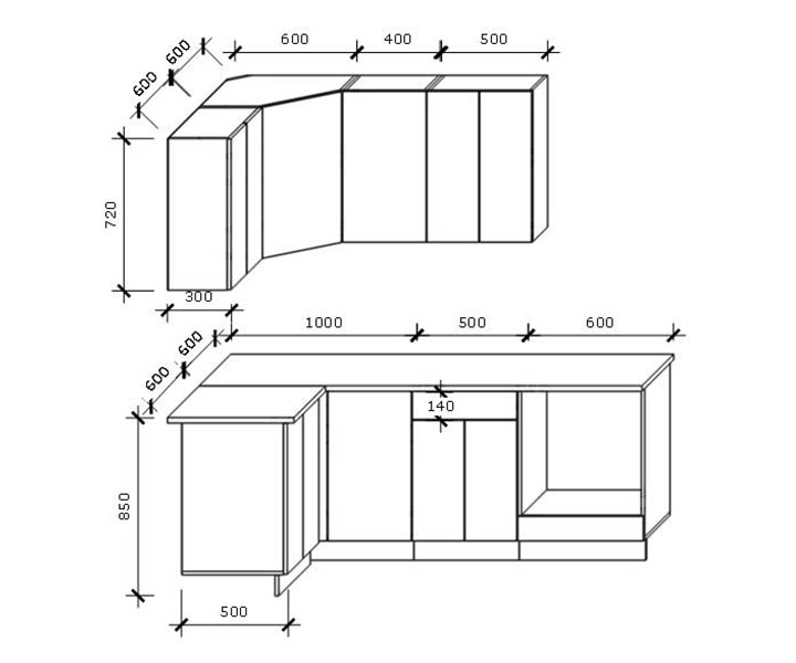 - Высота верхних шкафов: 720 мм.