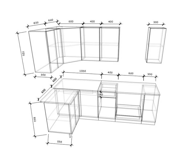 - Высота верхних шкафов: 720 мм.