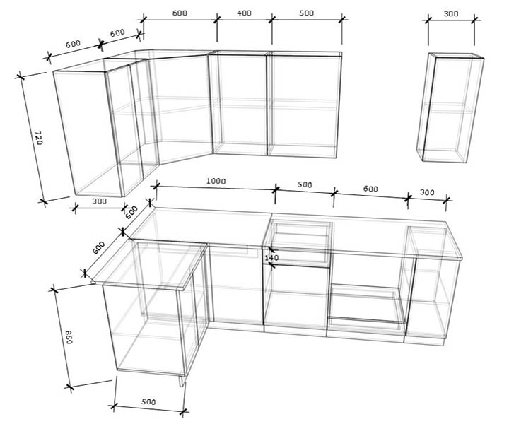 - Высота верхних шкафов: 720 мм.