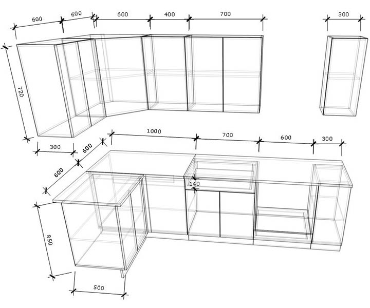 - Глубина нижних шкафов: 600 мм (по корпусу – 480 мм).
