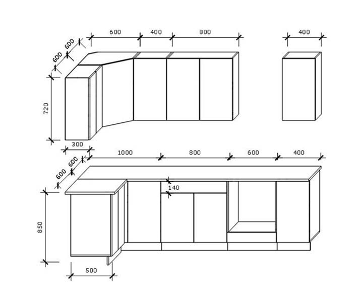 - Глубина нижних шкафов: 600 мм (по корпусу – 480 мм).