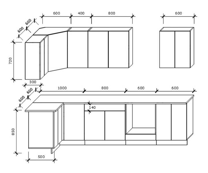- Глубина нижних шкафов: 600 мм (по корпусу – 480 мм).