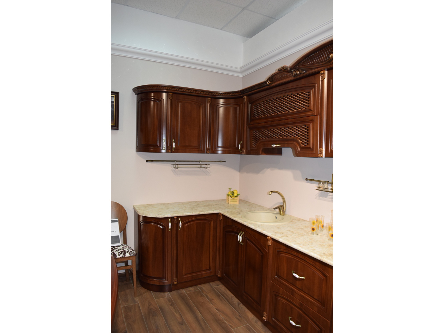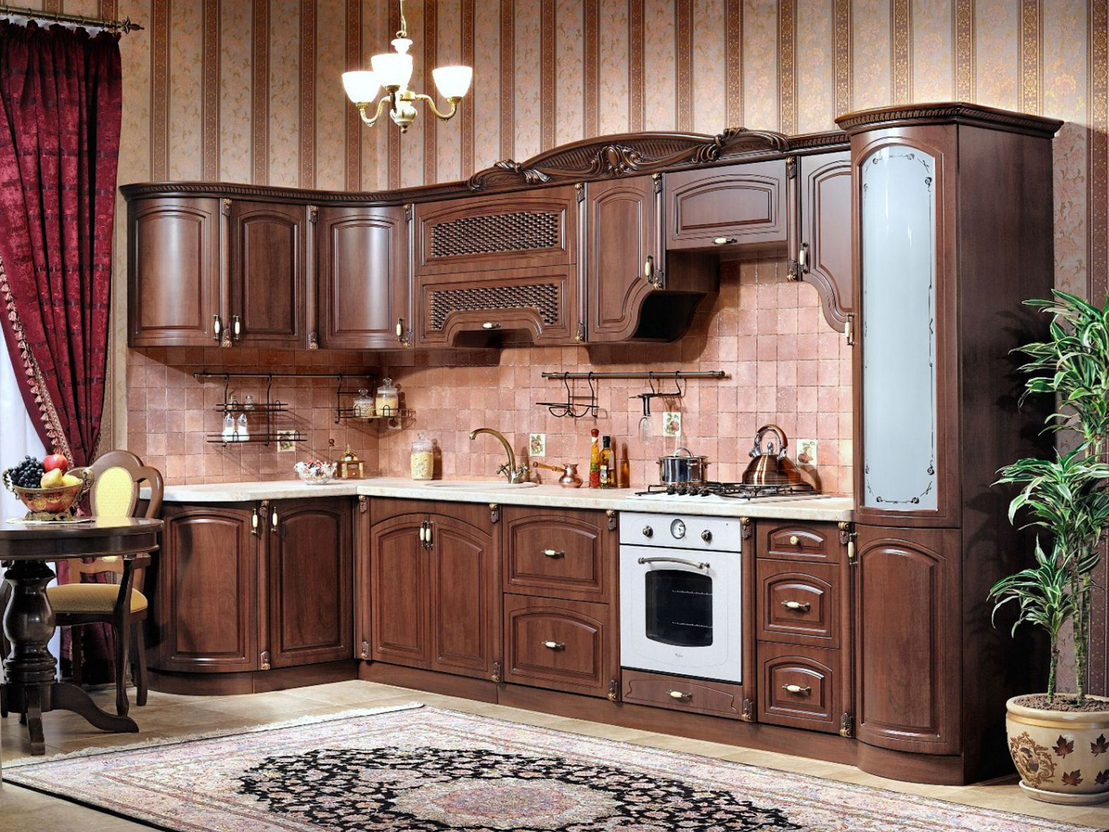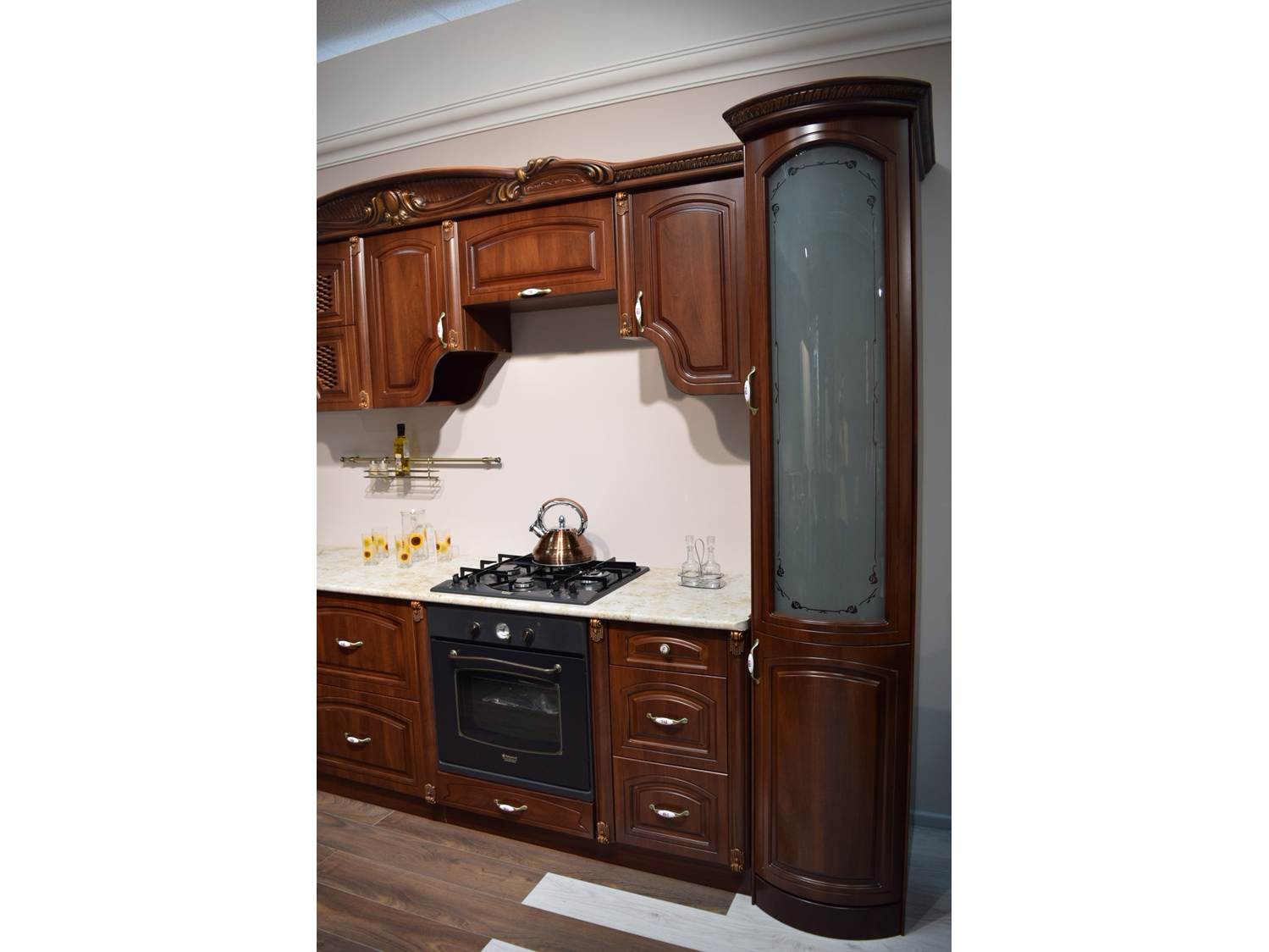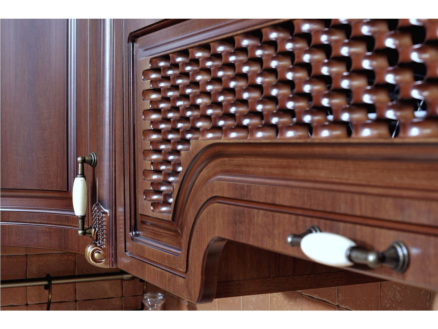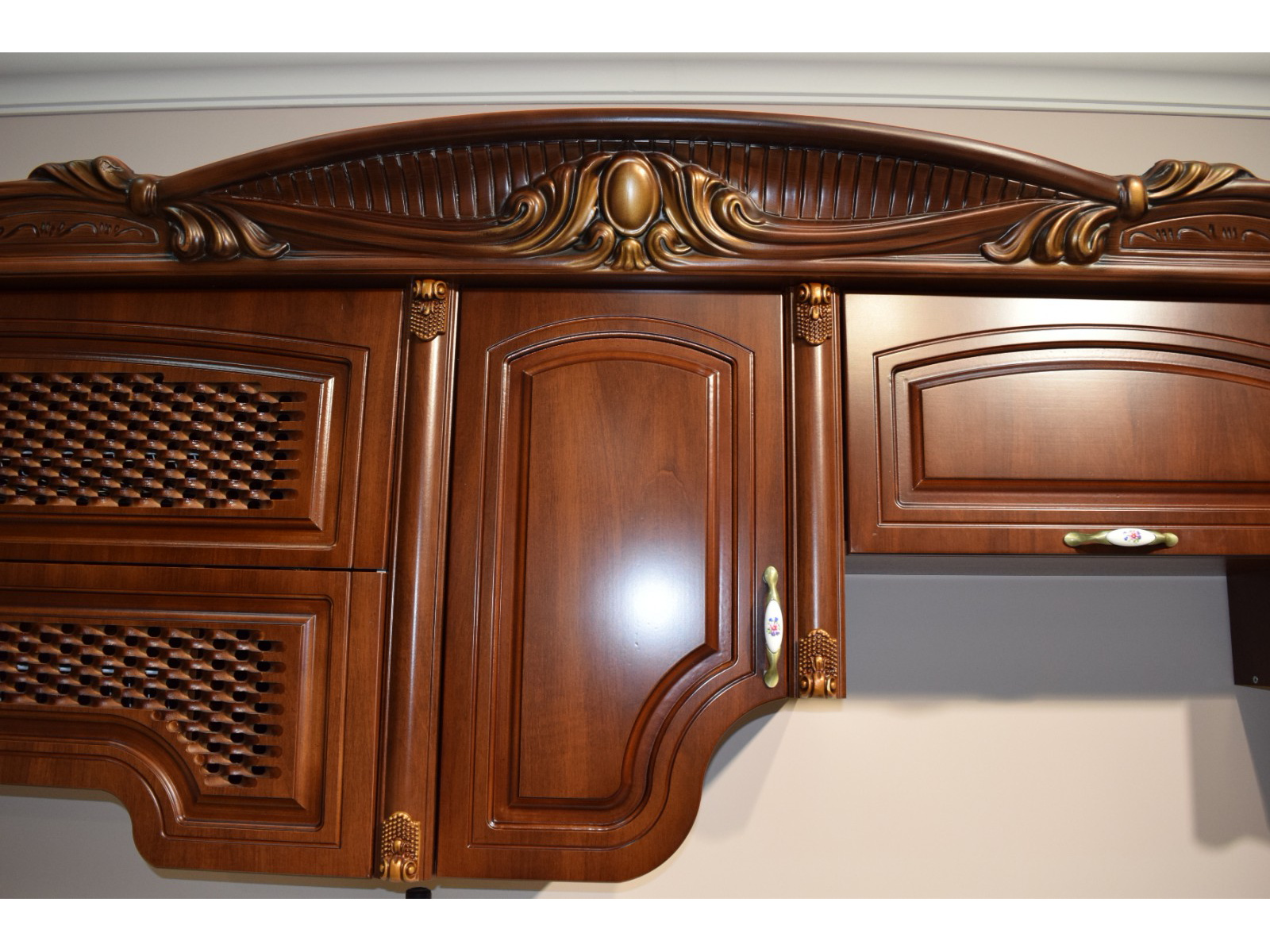 Декоративные элементы, фасады, накладки покрыты темной патиной и матовым лаком.