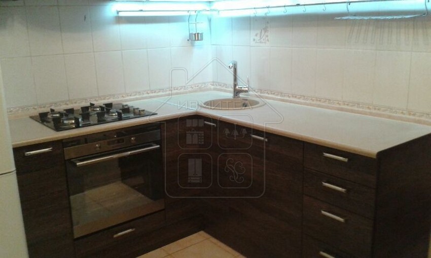 Кухня имеет угловую форму. Ее фасады выполнены в темном древесном цвете. Более светлая столешница сделана из постформинга. Прямая фурнитура гармонично сочетается с фасадами.