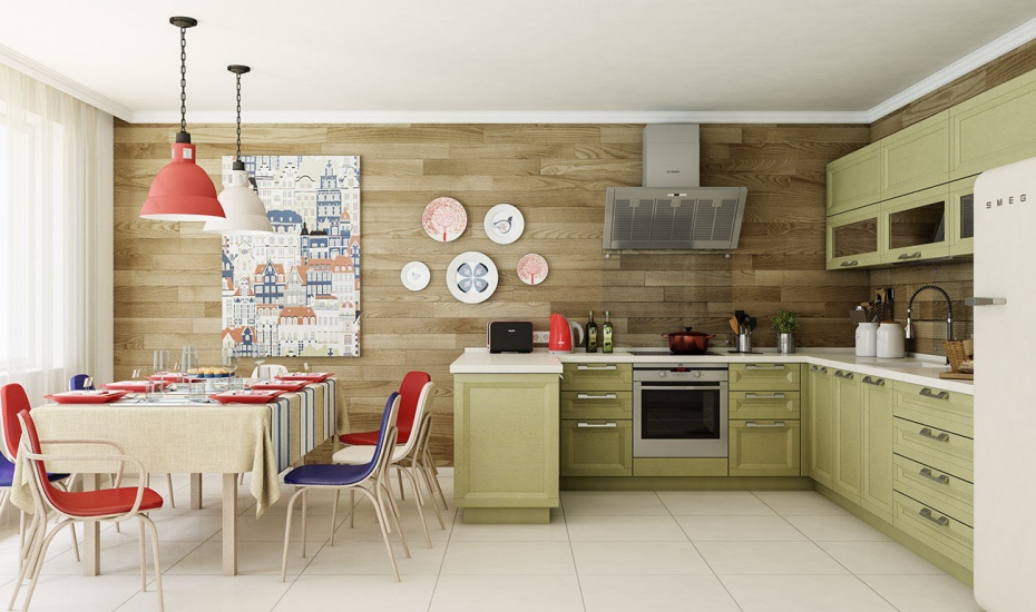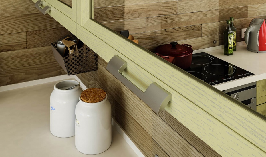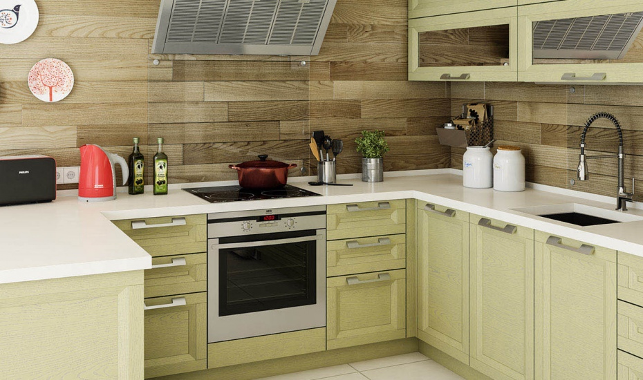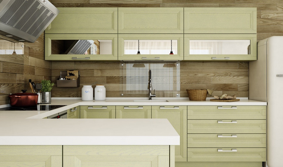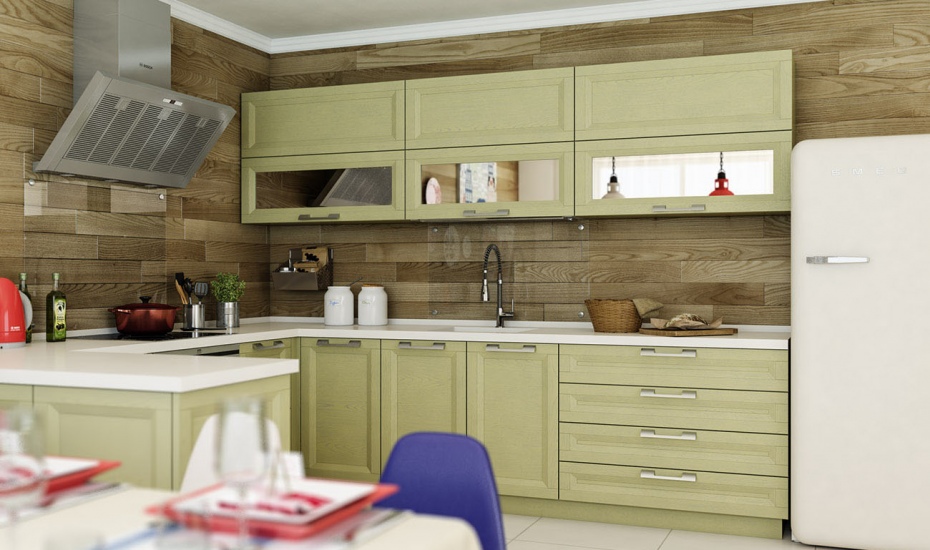 код 91557П-образная с небольшим выступом. Салатовые фасады с аккуратными филенками.