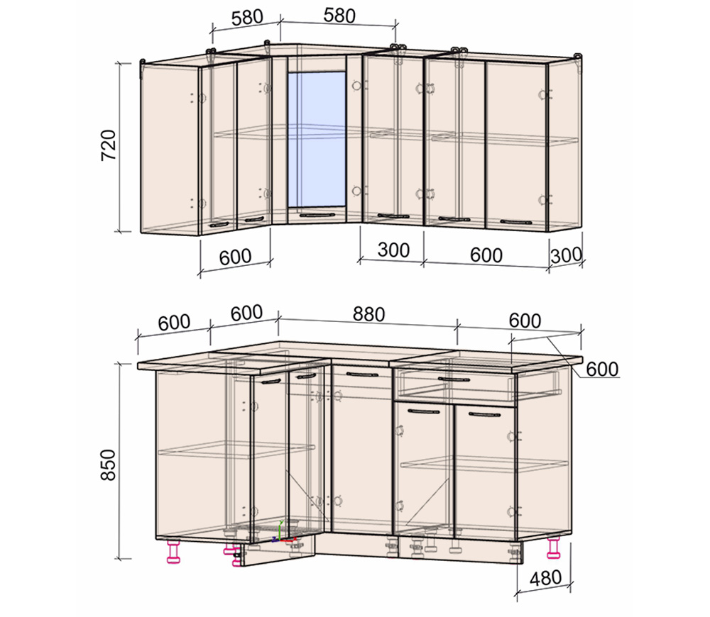 Материал фасада и корпуса: ЛДСП 16 мм. Ширина кухни 250 см.