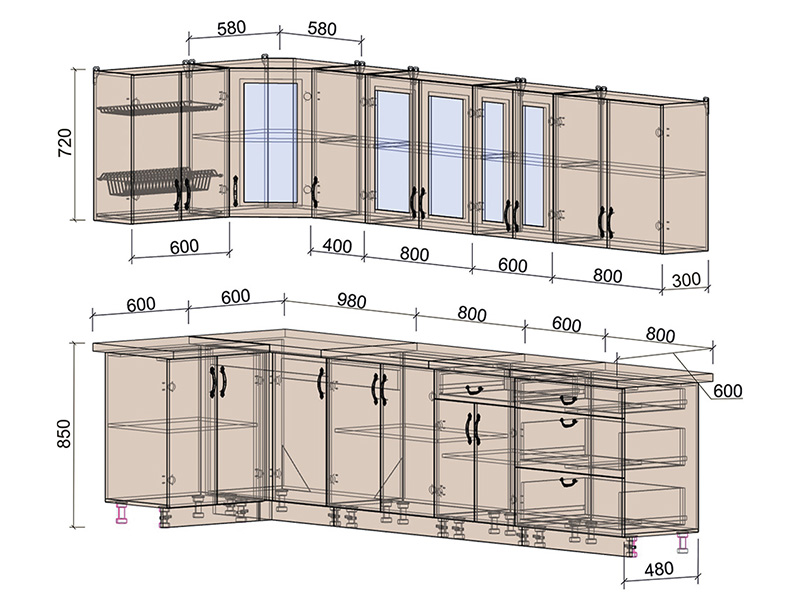 Глубина по корпусу: верхний ряд – 30 см, нижний ряд – 48 см.