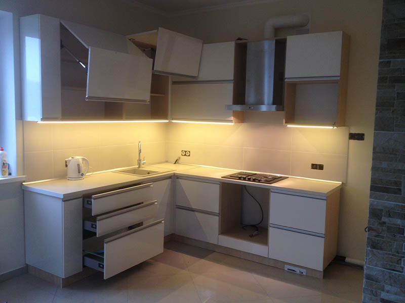 Стильная угловая кухня не загромождена лишними деталями. Модель исполнена в мягком дизайне и сочетает в себе красоту и многофункциональность. Шкафчики окрашены в белый цвет, придающий мебели привлекательную легкость. Каждый шкафчик оснащен качественной фурнитурой, позволяющей им плавно и бесшумно открываться. Для большего удобства при эксплуатации кухня оснащена подсветкой, освещающей рабочую зону.