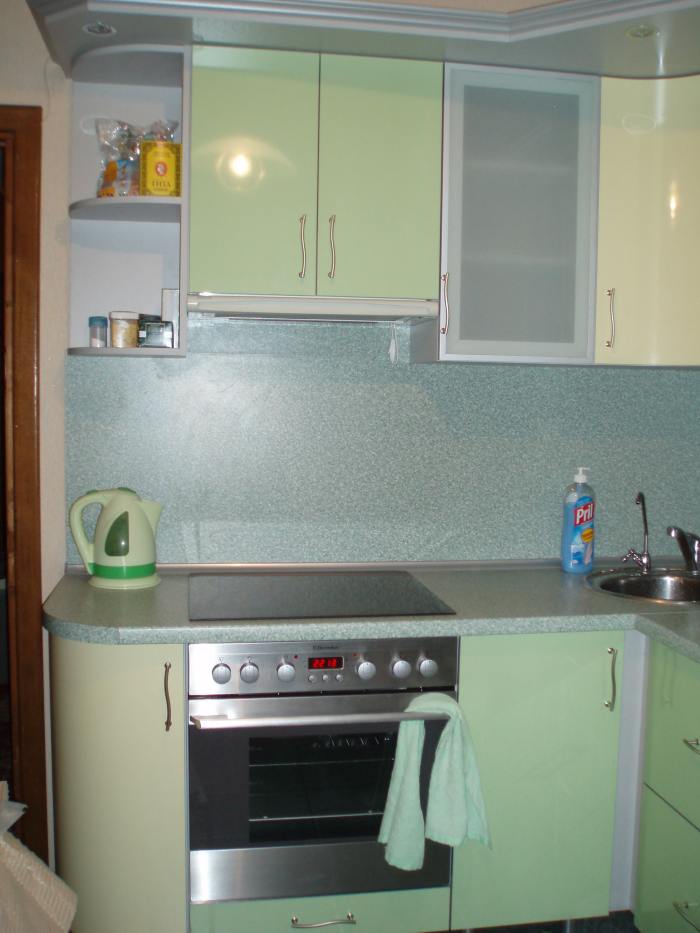 Кухня имеет нежно-зеленый цвет. Ручки ящиков изготовлены в волнообразной форме. Присутствуют дополнительные места для бытовой техники.
