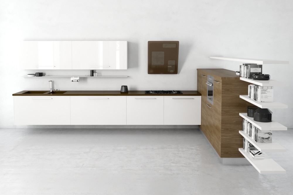 Представленная модель выполнена в базовой цветовой гамме. Сочетание белого и коричневого цветов смотрится весьма лаконично и утонченно. Декорируют фасады глянцевые переливы. Полки справа открытого типа вмещают достаточно большое количество элементов декора.