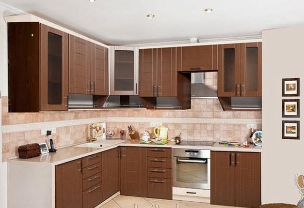 Фасад угловой кухни «Ника» выполнен из рамочного МДФ. Столешница исполнена в белом цвете, который отлично сочетается с ореховым цветом фасадов. Часть фасадов декорирована стеклянными вставками. Широкие прямоугольные ручки изготовлены из хрома.
